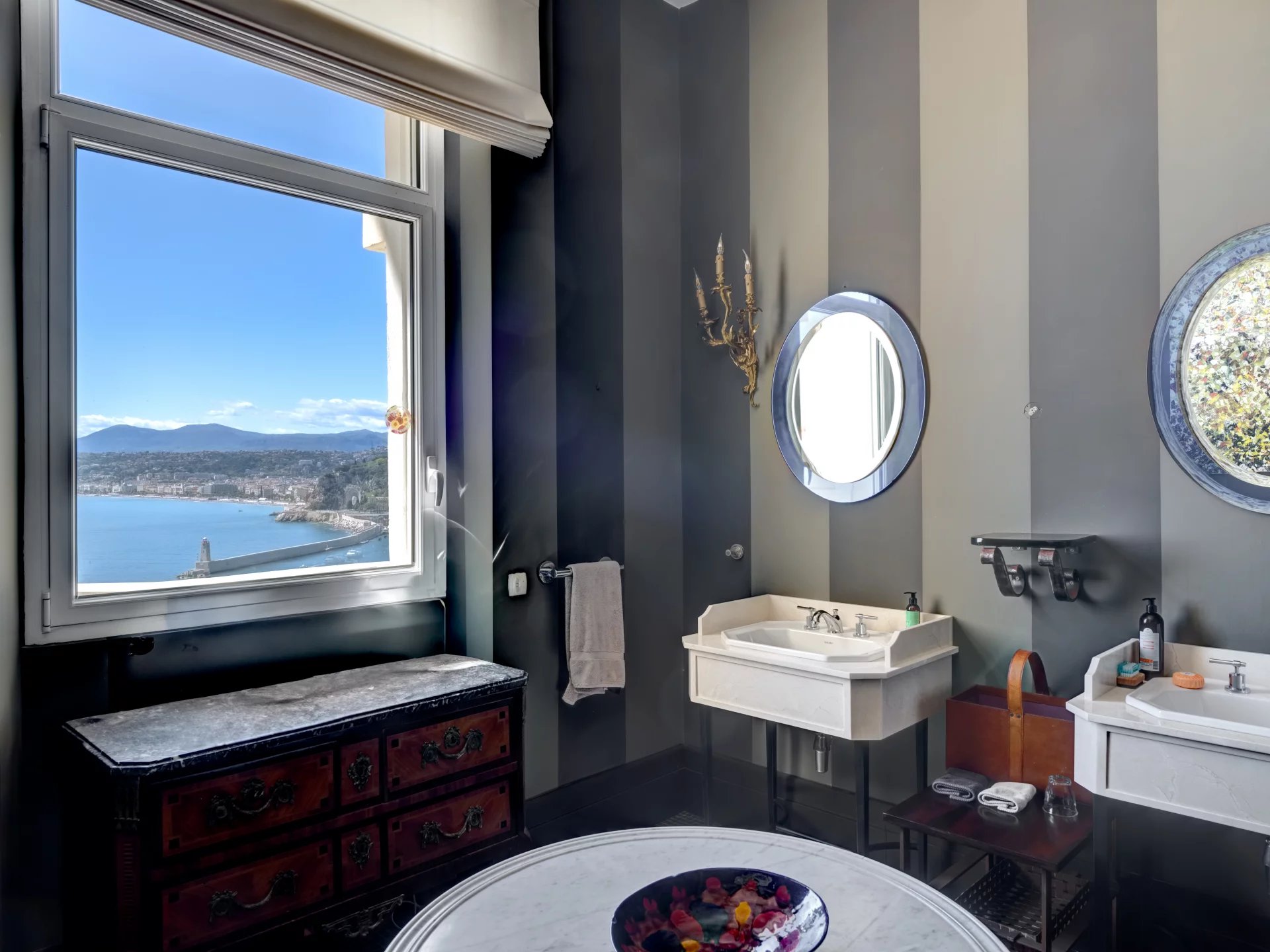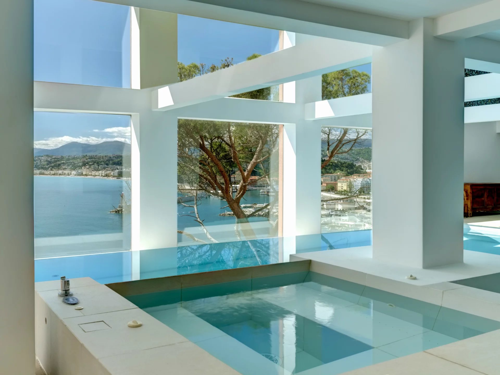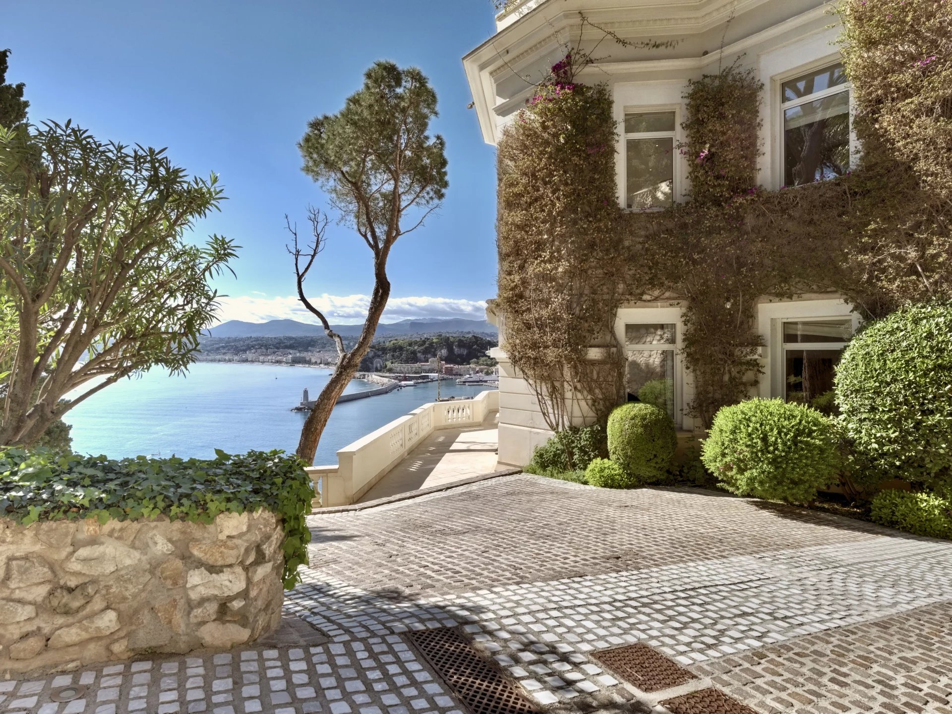 Set in private grounds directly above the sea front the property enjoys spectacular views looking directly over the Port and the water towards the Cap d'Antibes. It really feels like being in the front seat at the opera.