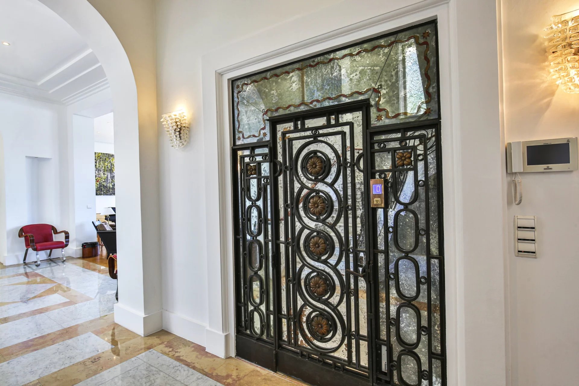 The property consists of a main house of exceptional proportions with a reception area that confronts you with the proximity of the sea as soon as you enter the room. The elegant architecture and period details are present throughout the property and have been lovingly preserved, mosaic inlays, wood panelling, wrought iron banisters, ceiling mouldings and even the original lift cabin.