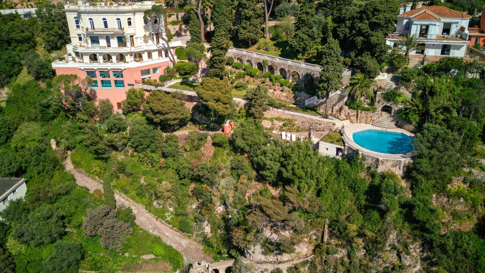 There is a dedicated spa area with a heated infinity pool opening onto lawned gardens and a gymnasium. The main bedroom suite occupies the entire top floor and is fitted with walk-in cupboards and 2 ensuite bathrooms. The dining room is surrounded by vast terraces and served by a fully fitted professional kitchen with a wine cellar and there are 3 further guest suites on the lower levels, a study and fifth bedroom at the entrance level. The sensational roof terrace on top of the main house, fitted with a barbecue area offers what must be the most spectacular view available in Nice.